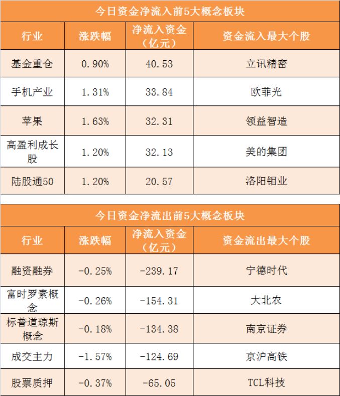 概念板块方面,今日基金重仓、手机产业、苹果、高盈利成长股等概念板块资金呈现净流入,其中基金重仓概念净流入40.53亿元居首。