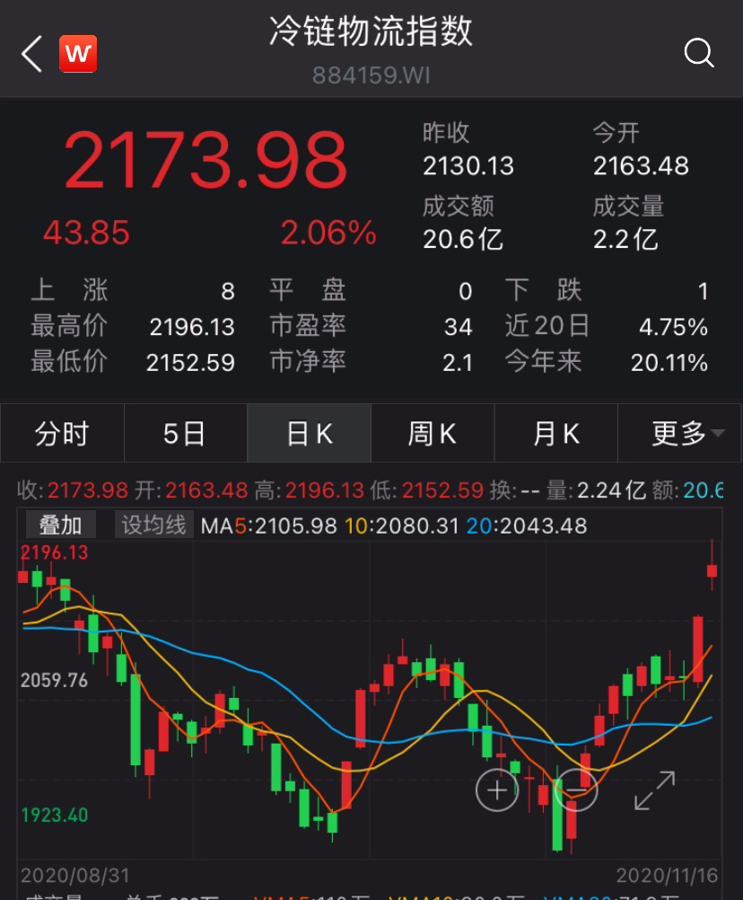 设备被疯抢的同时,股票市场上的冷链相关板块也有所反应。进入11月,冷链物流板块便开启持续走高的态势。该板块本月已累计上涨12.78%,远超沪指同期3.8%的涨幅。