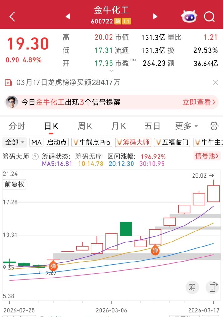 根据筹码大师监控,今日大涨的金牛化工,在3月11日出现“弹”信号,感兴趣的朋友可以自行跟踪判断。