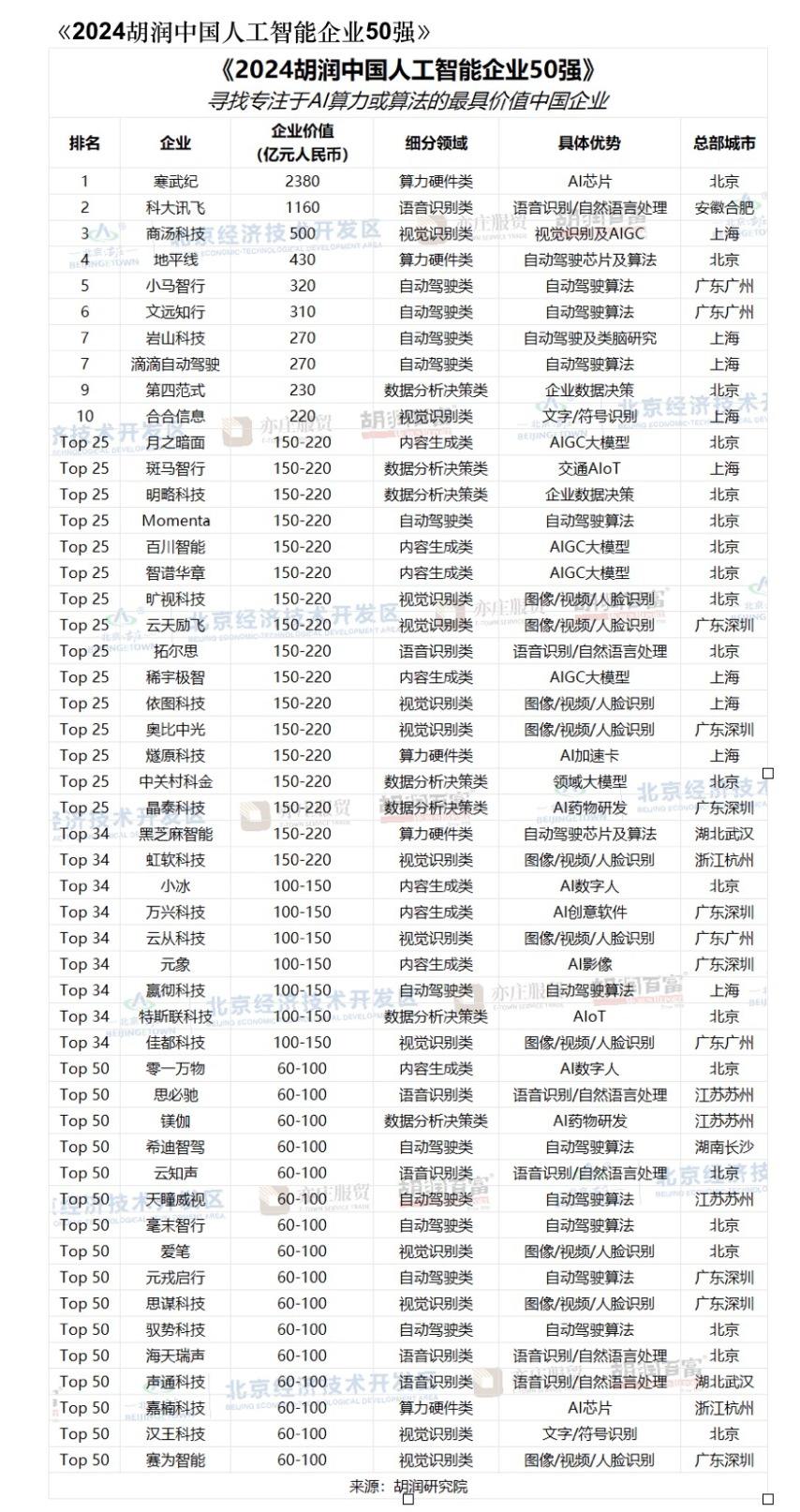 2024胡润中国AI企业50强:寒武纪(688256.SH)位居榜首 北京以20家上榜领先