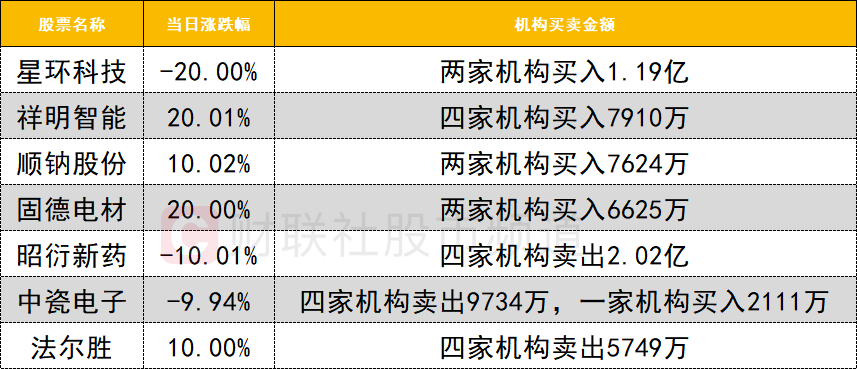今日龙虎榜机构活跃度明显降低,买入和卖出的个股数量和净买入规模大幅减少。储能概念局部走强,祥明智能20CM涨停,获四家机构买入7910万。CPO概念今日跌幅居前,中瓷电子触及跌停,遭四家机构卖出9734万。