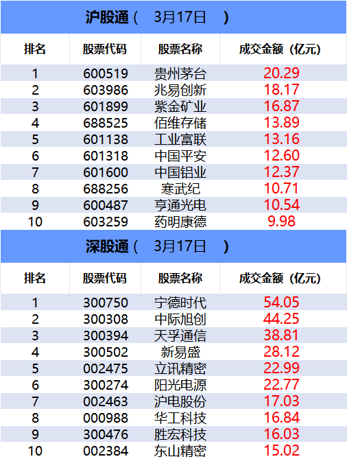 从深股通前十大成交个股来看,宁德时代位居首位;中际旭创和天孚通信分居二、三位。