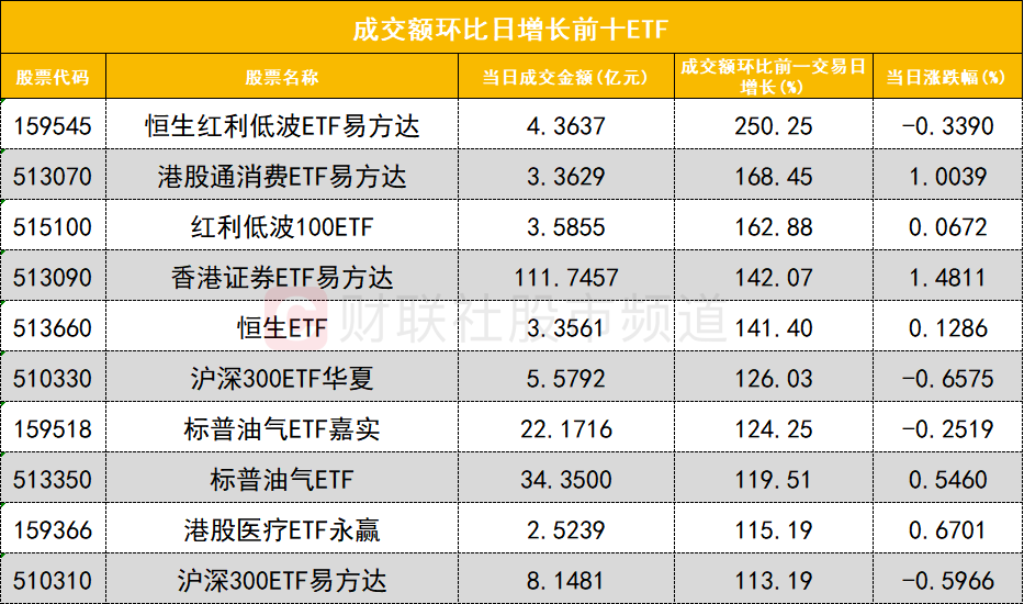 从成交额环比增长前十的ETF来看,恒生红利低波ETF易方达(159545)成交额环比增长250%位居首位;港股通消费ETF易方达(513070)成交额环比增长168%位居次席。