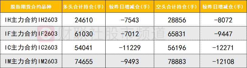 四大期指主力合约中,IH、IF、IC、IM合约多空双方均减仓,IF、IM合约空头减仓数量较多。