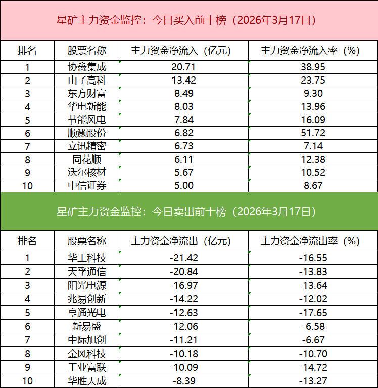 主力资金流出前十的个股所属板块较为分散,华工科技净流出居首。