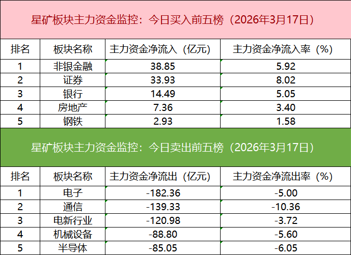 板块资金流出方面,电子板块主力资金净流出居首。