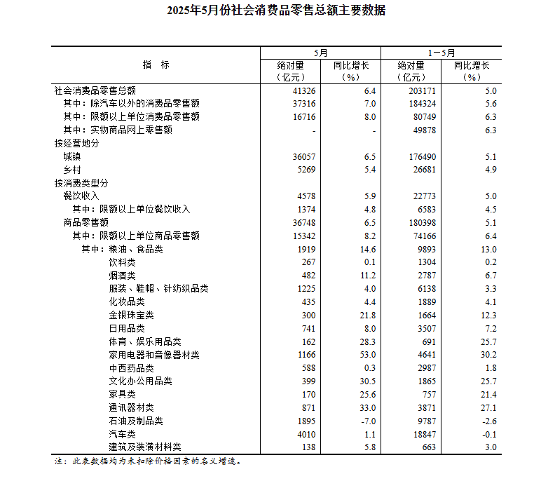 5月份,社会消费品零售总额41326亿元,同比增长6.4%。其中,除汽车以外的消费品零售额37316亿元,增长7.0%。1—5月份,社会消费品零售总额203171亿元,增长5.0%。其中,除汽车以外的消费品零售额184324亿元,增长5.6%。