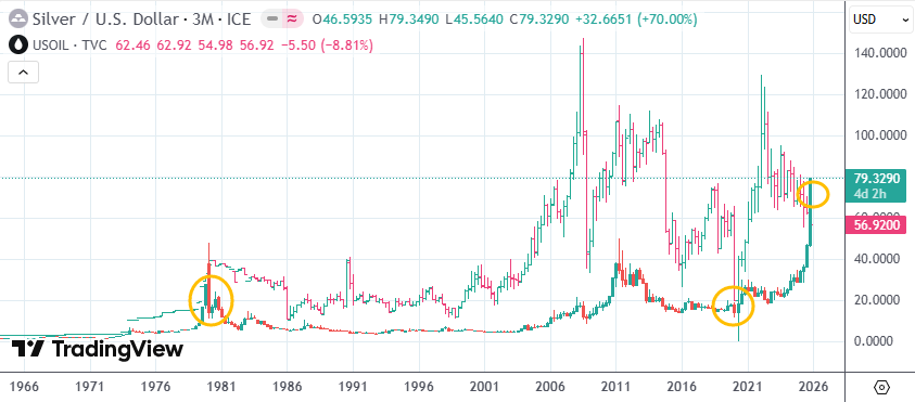 这意味着,一盎司白银的价格已超过一桶美国原油——上一次出现这一情形还是在2020年4月份,当时新冠疫情爆发重创能源价格,但之后油价很快收复了跌幅;再早的纪录则要追溯到1980年。