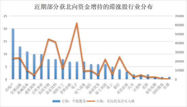 近期的热点板块医药生物、电子行业也分别有8、7只滞涨股获北向资金增持,虽然股票数量不及前几类行业,但从净买入额来看,电子、医药生物行业列前两位,分别达6.23、4.45亿元,两行业股均净买入额超过7000万元。