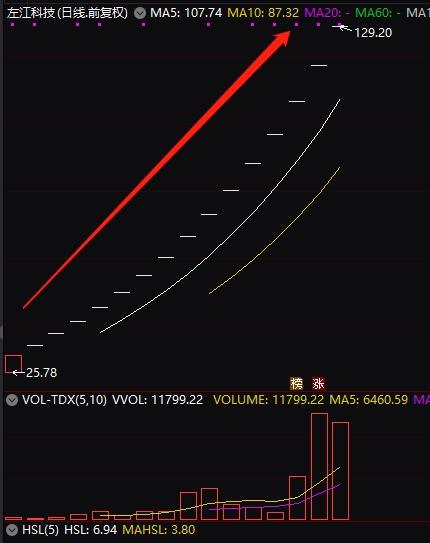 今日,创业板新股左江科技(代码:300799)再度一字涨停,自今年10月29日上市以来已经连续16个一字涨停,今日收盘价129.2元,较21.48元的发行价涨幅高达501.49%。