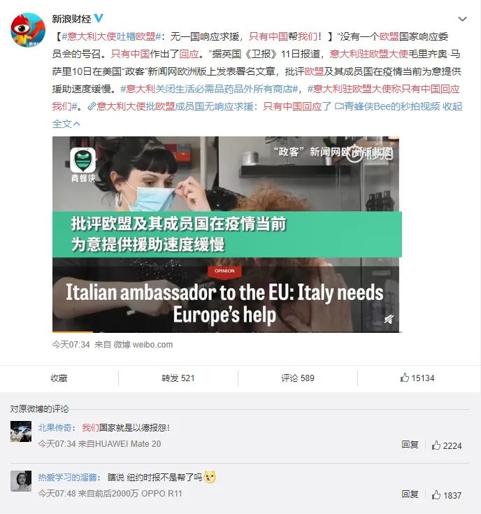 【#意大利大使吐槽欧盟#:无一国响应求援,只有中国帮我们!】“没有一个欧盟国家响应委员会的号召。只有中国作出了回应。”据英国《卫报》11日报道,意大利驻欧盟大使毛里齐奥·马萨里10日在美国“政客”新闻网欧洲版上发表署名文章,批评欧盟及其成员国在疫情当前为意提供援助速度缓慢。#意大利关闭生活必需品药品外所有商店#,#意大利驻欧盟大使称只有中国回应我们#。O意大利大使批欧盟成员国无响应求援:只有中国回应了