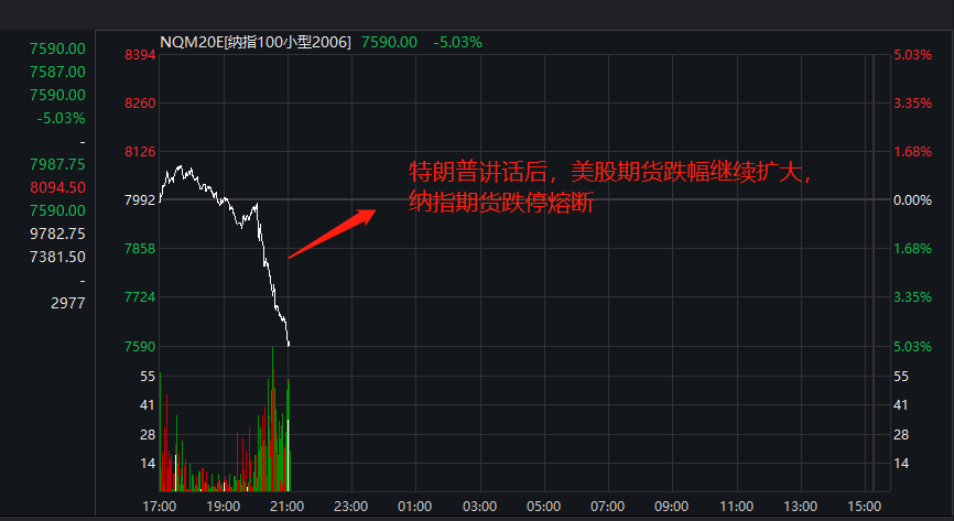 美国首都华盛顿宣布进入紧急状态后,美国总统特朗普在美东时间晚上(北京时间今早)发表全国电视讲话,然而美股期货的跌幅更大。道琼斯指数期货跌幅超3%,纳指期货触发熔断,跌幅超5%。