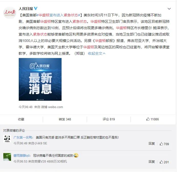 根据人民日报,美东时间3月11日下午,因为新冠肺炎疫情不断加剧,美国首都华盛顿特区宣布进入紧急状态。华盛顿特区卫生部门官员表示,该地区目前新冠肺炎确诊病例总数达到10例,且预计后续将出现更多确诊病例。