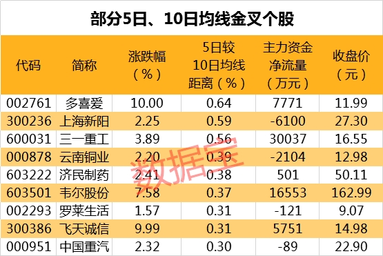 最新数据显示,有16只A股的5日均线主动上穿10日均线,其中多喜爱、上海新阳、三一重工等个股的5日均线较10日均线距离最大,分别达0.64%、0.59%、0.56%。