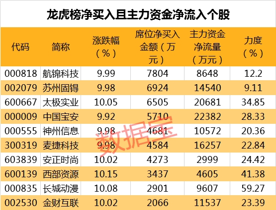 从盘口资金流向来看,主力资金净流入超五千万且龙虎榜净买入个股共有10只,其中晶盛机电、中国宝安、太极实业等个股资金净流入金额最大。净流入力度最大的个股有欣龙控股、长城动漫、西部资源,净流入力度分别为59.88%、59.27%、41.38%。