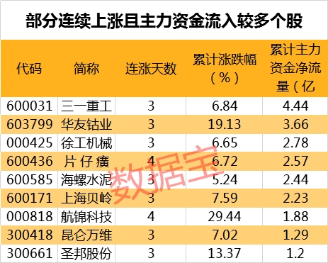 值得注意的是,108只连续上涨个股中,10只个股期间主力资金累计净流入超过亿元。其中,累计资金流入最多的为三一重工,主力资金累计流入4.44亿元。(数据宝 张娟娟)