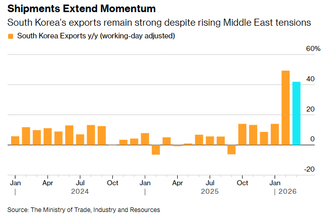 当前出口展现出的韧性,或为韩国央行维持谨慎货币政策提供支撑,政策制定者需在稳健外需与不断上升的金融稳定风险之间寻求平衡。韩国央行上月表示,金融体系整体保持稳定,但同时警告,伊朗冲突引发的局势升级,可能导致汇市及资产市场出现剧烈波动。