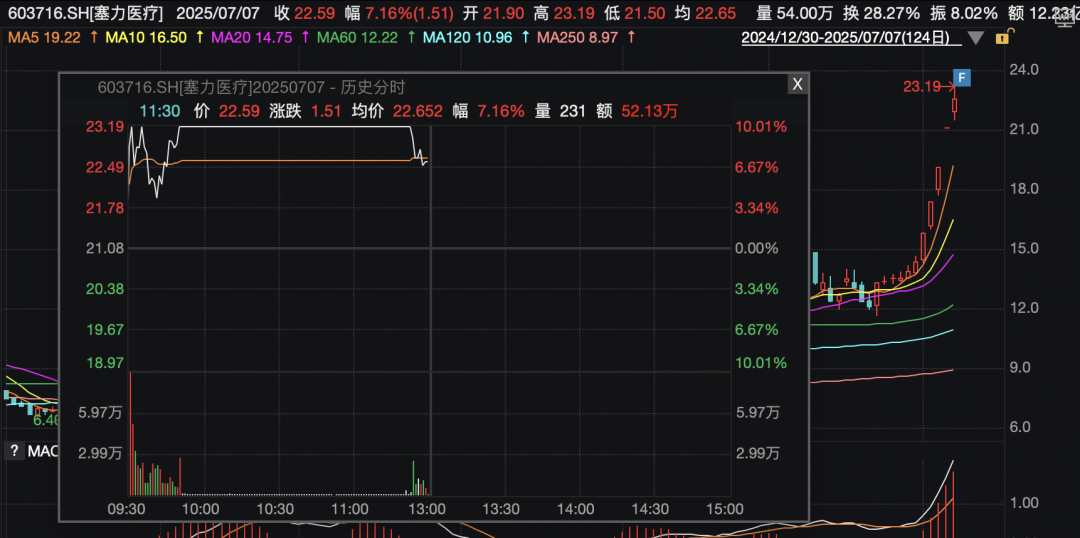 塞力医疗连续第5个交易日盘中涨停,随后打开涨停板,截至午间收盘,涨幅收窄至7%左右。