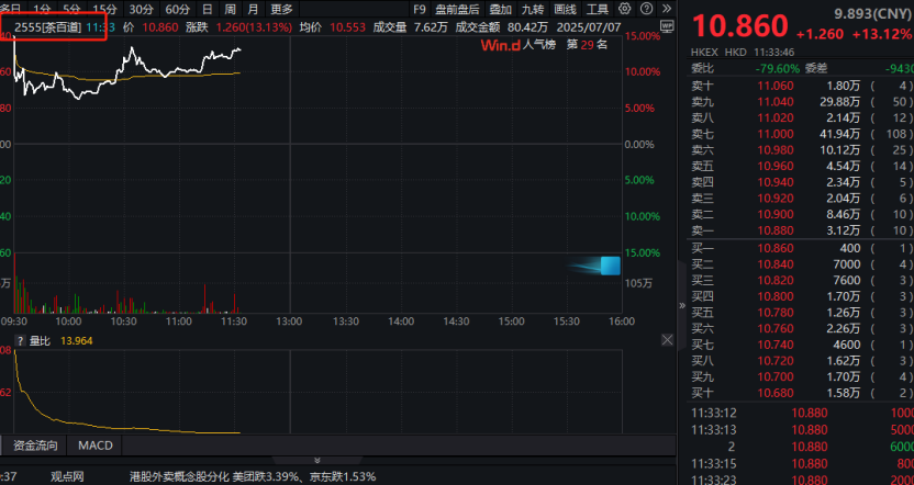 港股市场新茶饮赛道个股集体走强,茶百道盘中涨幅一度达15%,古茗盘中涨幅一度超过13%,奈雪的茶盘中涨幅一度超过10%,蜜雪集团盘中涨幅一度达7%。