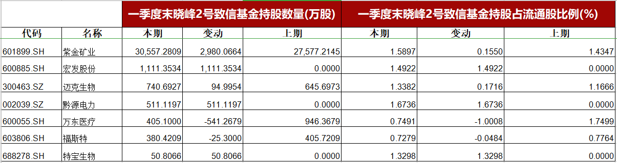 具体来看,截至今年一季度末,高毅晓峰2号致信基金所持有的7只A股包括紫金矿业、宏发股份、迈克生物、黔源电力、万东医疗、福斯特、特宝生物。其中该基金一季度新进了宏发股份、黔源电力、特宝生物,增持了紫金矿业、迈克生物,减持了万东医疗、福斯特。