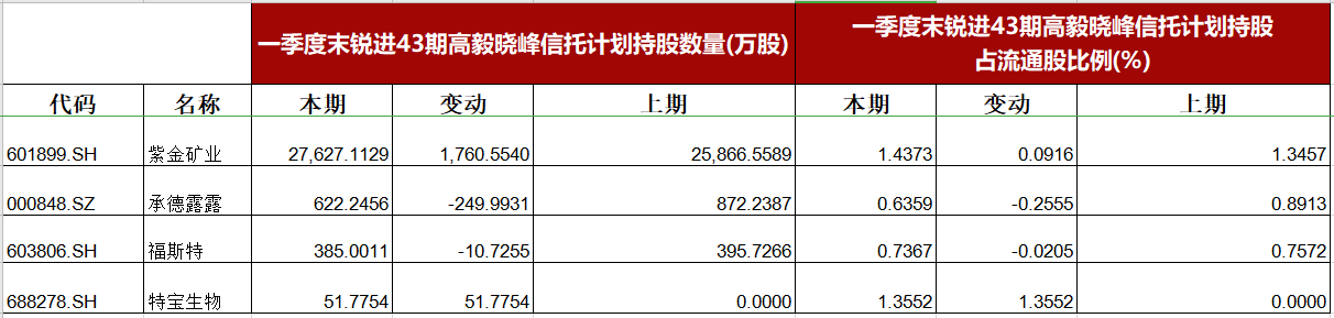 今年一季度末锐进43期高毅晓峰信托计划持股情况
