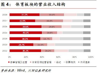 业绩保持稳定增长。2018年,公司实现营业收入14.50亿元,较上年同期增长33%;归属于上市公司股东净利润为8391万元,较上年同期增长44%。体育板块增长稳健,赛事运营和场馆营业占比较高。2018年,公司体育板块实现营业收入5.61亿元,同比增长27.7%,占总收入的38.7%。具体结构方面,赛事运营和场馆运营业务是体育板块的主要业务,占比分别为37.1%和30.3%,经纪、彩票、休闲健身等业务占比相对较小。