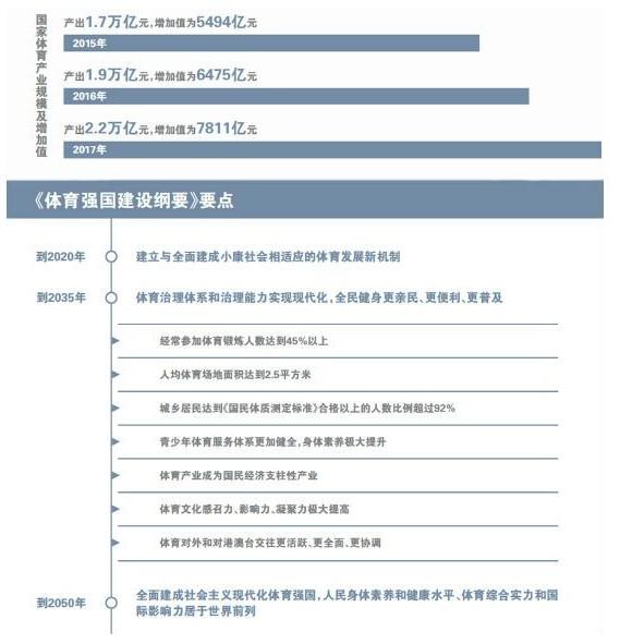 体育产业连续刷屏,行业迎来新机遇。9月2日国务院办公厅印发《体育强国建设纲要》,明确三大战略目标。2020年建立与全面建成小康社会相适应的体育发展新机制,2035年,形成与基本实现现代化相适应的体育发展新格局,2050年全面建成社会主义现代化体育强国。