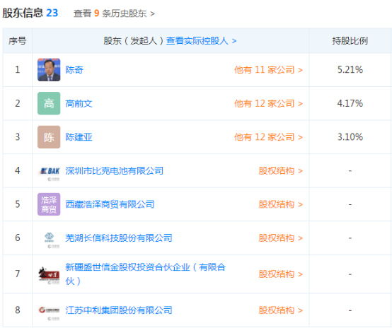 天眼查显示,成立于2005年的比克动力,法人代表为李向前,其中,直接参股的上市公司股东包括长信科技(300088)和中利集团(002309);自然人股东陈奇、高前文分别持股5.21%和4.17%。值得注意的是,陈奇为长信科技前任董事长,高前文为长信科技现任董事长。