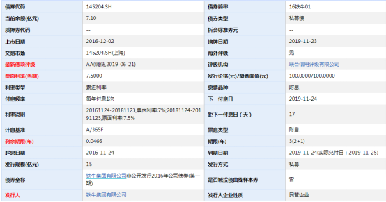 “16铁牛01”为私募券,初始发行规模15亿元,目前存续规模7.1亿元,期限2+1年,起息日2016年11月24日,当期票面利率7.5%,华福证券承销。