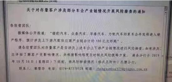 一个月前,网曝一份某股份银行的内部邮件,要求对猎豹汽车、众泰汽车、华泰汽车、力帆汽车四家车企上下游产业链情况展开内部风险排查,该股份行在通知中明确,“据媒体公开报道:猎豹汽车、众泰汽车、华泰汽车、力帆汽车四家车企年底将进入破产程序,预计涉及上下游汽配供应商产业链合计约500亿元坏账。”