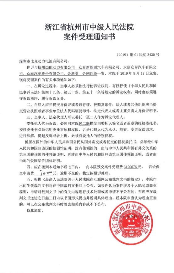 不过,由于众泰汽车方面在协议签订后未履约,比克动力于9月2日再次向杭州市中级人民法院对其提起诉讼,并申请财产保全,冻结众泰系四家公司合计4183万元财产。新的诉讼已于9月17日立案。