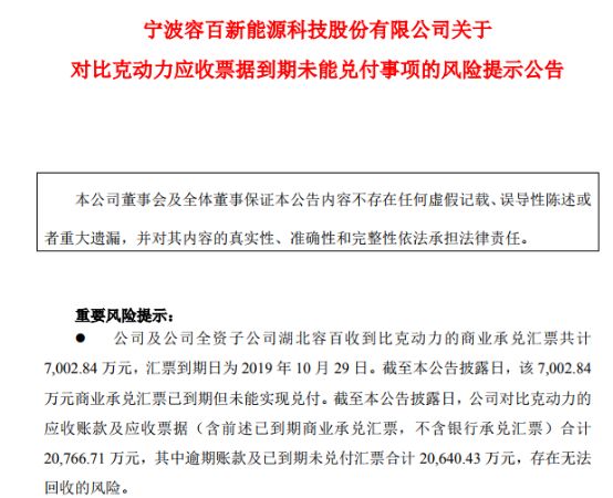 11月6日晚间,停牌一天的科创板企业容百科技(688005)公告称,公司及公司全资子公司湖北容百收到深圳比克动力电池有限公司(以下简称“比克动力”)的商业承兑汇票共计7002.84万元,汇票到期日为2019年10月29日。截至公告披露日,该7002.84万元商业承兑汇票已到期但未能实现兑付。