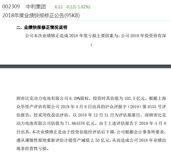 2019年4月15日,中利集团披露《2018年度业绩快报修正公告》,对2019年2月26日披露的业绩快报数据进行修正,预计归母净利润由盈利3088.75万元修正为亏损2.83亿元。业绩修正的主要原因,就包括公司对持有的深圳市比克动力电池有限公司8.29%的股权补充计提2.55亿元资产减值。