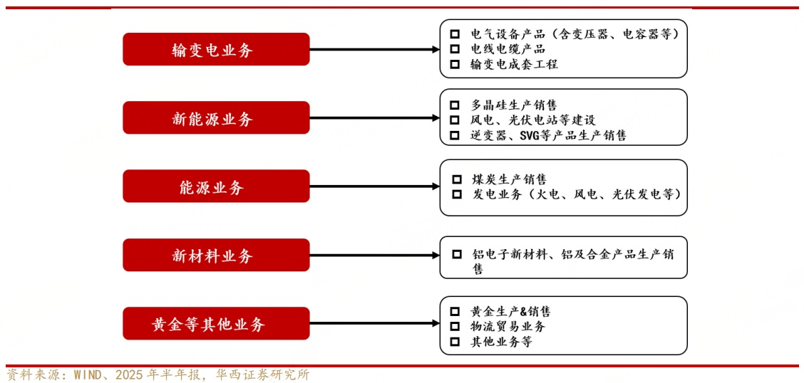 特变电工作为全球能源事业系统解决方案服务商,主营业务涵盖输变电业务、新能源业务、能源业务以及新材料业务四大板块,各板块协同发力构筑综合竞争优势。输变电业务是公司根基与核心盈利来源,以变压器为核心,包括各种类变压器、开关、电抗器等输变电产品和成套工程服务等;能源业务为公司生产经营提供稳定能源供应,通过原材料自给能力对冲铜、硅钢片等价格波动风险,包括煤炭、电力与热力等;新能源业务主要有高纯多晶硅、逆变器、光伏电站建设等业务,为变压器提供了新能源并网场景需求,形成“设备+场景”的协同闭环;新材料业务包括高纯铝、电子铝箔等,可用于变压器核心部件制造,进一步完善产业链配套能力。