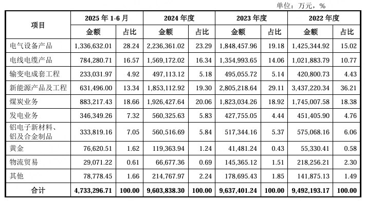 2025年上半年分产品营收数据显示,公司业务结构呈现“电气设备主导、多板块协同”的特征,其中电气设备产品营收占比从2024年度的23.29%提升至28.8%,凸显了以变压器为核心的输变电业务的战略核心地位,而电线电缆、输变电成套工程等关联业务也保持稳定贡献。对比2024年度,煤炭业务营收占比从19.97%降至17.58%,新能源产品及工程占比从13.81%降至13.34%,发电业务占比从5.54%提升至7.73%,反映出公司正逐步优化业务结构,进一步聚焦变压器等高端电气设备的研发与销售。