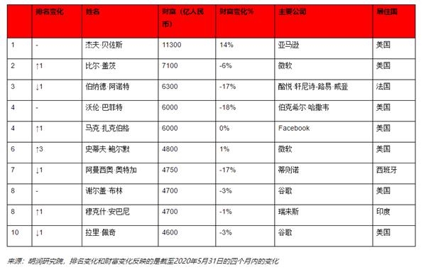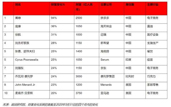 6月23日,胡润研究院发布《疫情四个月后全球企业家财富变化特别报告》(下称“报告”),研究了胡润全球富豪榜上的企业家在截至2020年5月31日的四个月内的财富变化。