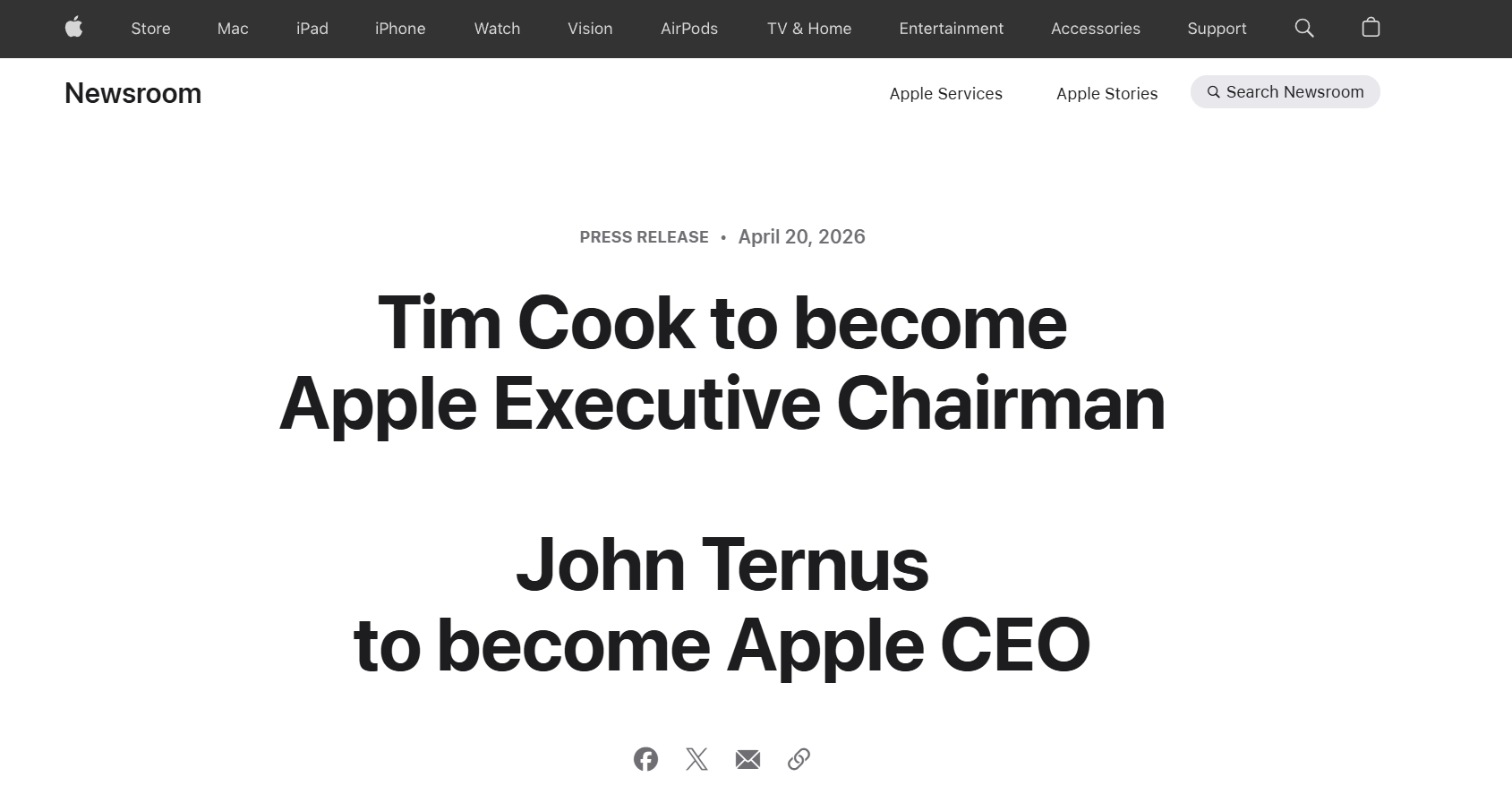 苹果公司在新闻中心发布公告称,现任硬件工程高级副总裁特努斯将于2026年9月1日接替库克担任首席执行官——时间安排得恰到好处,届时苹果公司9月份的大型发布会将由特努斯负责。