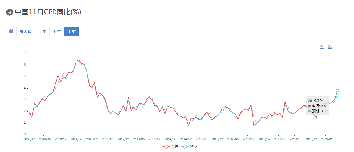WIND数据显示,共有18家机构发布11月CPI预测,预测最小值为4%,预测最大值为4.60%,预测平均值为4.3%,如果达到预期,则可能刷新2012年以来的月度新高。