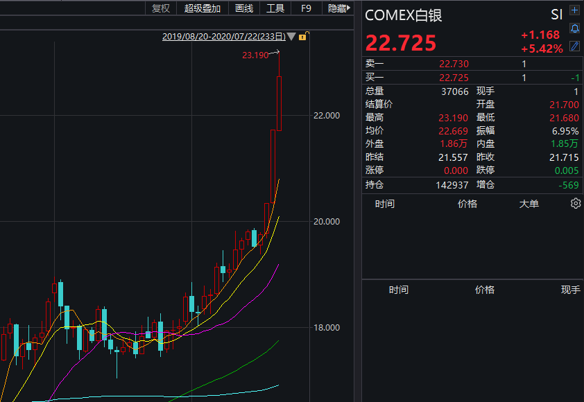 而美元的下跌及避险需求的上升,推动国际黄金和白银价格不断攀升。隔夜COMEX黄金价格疯涨,短短10多分钟爆拉逾21美元,最高至1866.9美元/盎司,涨幅达1.25%,创近九年来新高。黄金的上涨,也带动白银走高。COMEX白银价格一度大涨逾7%,至23.15美元/盎司,创近7年来新高。而此前一交易日,白银价格已经暴涨7.04%,两个交易日累计最大升幅已经超过14%。