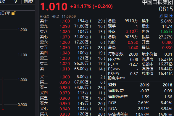 国内外金银价的暴涨,又带动了贵金属板块的大幅拉升。港股中国白银集团在昨日暴涨18.46%的基础上,今日早盘再次高开高走飙升27.27%。中富资源大涨19.79%、龙资源涨16.36%、中国黄金国际涨11.03%,潼关黄金、山东黄金、灵宝黄金、紫金矿业等亦有不俗表现。