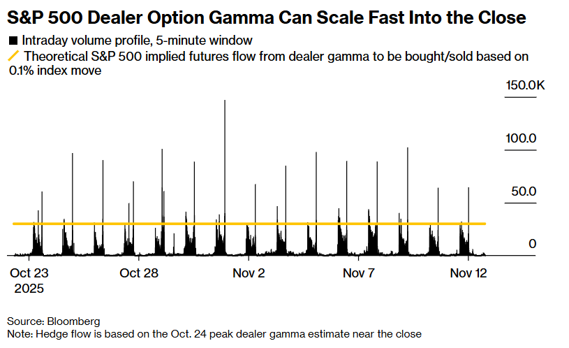 当天收盘时的交易情况尤为复杂。在10月24日的这一近期最极端例子中,标普500指数做市商的gamma数值在当日收盘前10分钟达到了大约900亿美元的峰值。戴蒙德指出,这意味着大约0.1%的现货变动将引发约100亿美元的市场买卖流动。