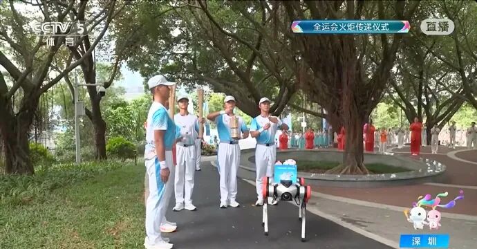 在深圳,人形机器人“夸父”以“0号火炬手”的身份亮相,其作为特殊火炬手,手握1.6kg重量的火炬,完成第二棒与第三棒之间的传递;机器狗将全运会吉祥物交给火炬手。