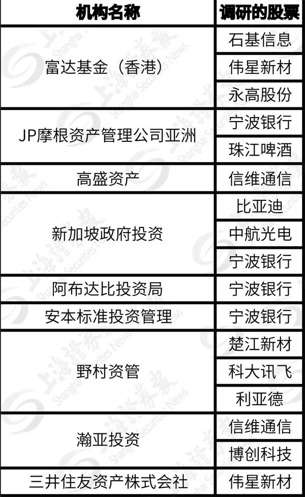 值得一提的是,宁波银行同时获得JP摩根资产管理公司亚洲、新加坡政府投资、阿布达比投资局和安本标准投资管理四家资管巨头组团调研;伟星新材同时获得富达基金(香港)和三井住友资产株式会社的关注。
