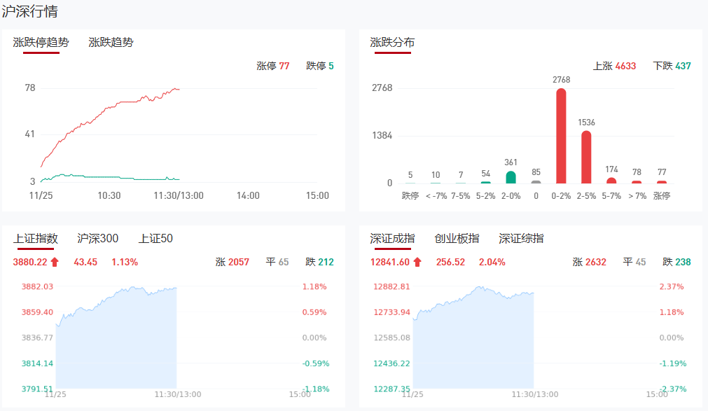 市场早盘集体走强,沪指涨超1%,创业板指涨超2%。沪深两市半日成交额1.17万亿,较上个交易日放量1493亿。盘面上热点轮番活跃,全市场近4900只个股上涨。从板块来看,算力硬件概念延续强势,特发信息3连板,长飞光纤、汇绿生态涨停。AI应用概念再度爆发,实达集团4连板,榕基软件7天6板。抗流感概念表现活跃,广济药业2连板,特一药业、北大医药涨停。下跌方面,养殖板块震荡调整,獐子岛、中水渔业触及跌停。