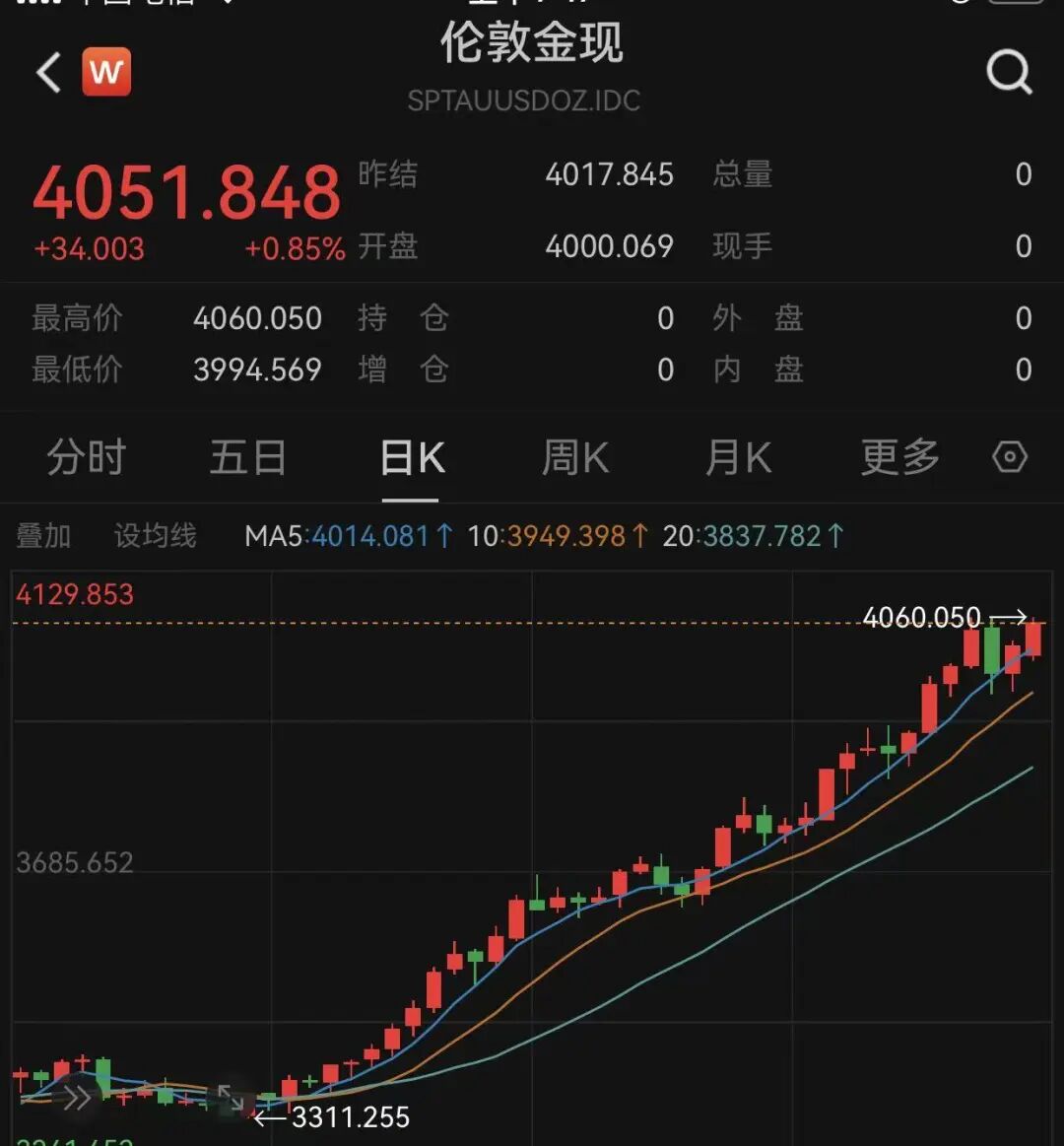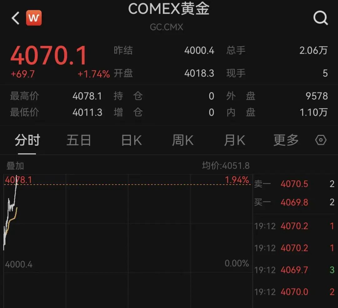 截至发稿,现货黄金涨超0.8%,突破4050美元/盎司,盘中一度触及4060美元,COMEX黄金涨超1.7%,也突破4070美元/盎司。