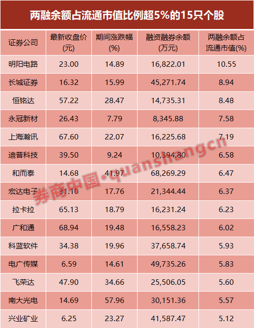 另外一个衡量因素,即个股两融余额与流通市值的比例来看,有15只个股的两融余额占流通市值的比例超过5%,其中明阳电路占比超10%,长城证券、恒铭达、永冠新材、上海翰讯等个股两融余额占流通市值比例超7%。