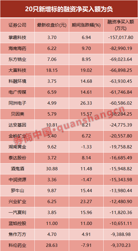 另外,也有20只个股的融资净买入额为负。其中掌趣科技融资净买入额为-15.7亿元,海南海药为-8.29亿元,东方锆业、大富科技、科融环境、电广传媒、同洲电子的融资净买入额均在-6亿以下。大型券商两融业务人士表示,“因为还款的人比较多,造成融资净买入额为负,这说明杠杆资金在退出这些个股,意味着不看好这些个股的后市。”