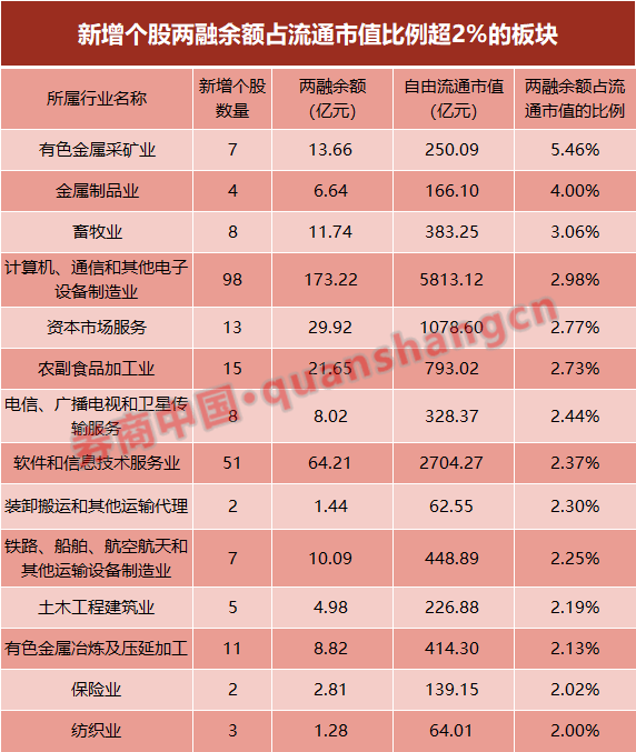 从板块来看,按证监会行业统计,记者梳理发现,有色金属采矿业新增标的两融余额占流通市值的比例最高,达到5.46%,金属制品行业新增标的该比例达到4%,畜牧业、计算机和通信业、资本市场服务业、电信广播电视业等多个板块的该比例都超过2%。