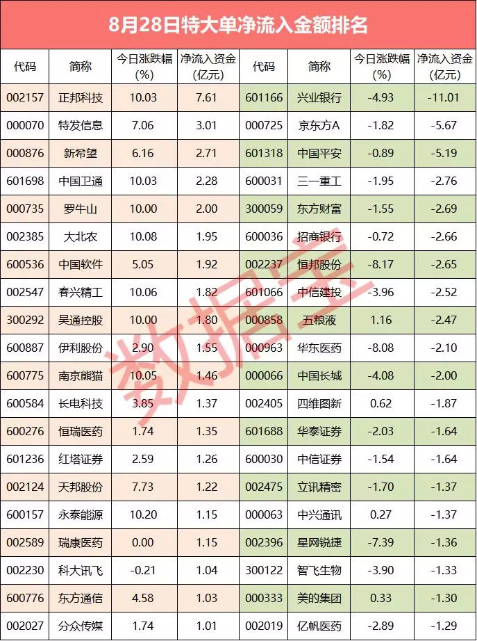 具体到个股来看,今日有22股特大单净流入超亿元。正邦科技特大单净流入7.61亿元,净流入资金规模居首;特发信息特大单净流入资金3.01亿元,位列第二;新希望、中国卫通、罗牛山净流入资金也居前,均超2亿元。