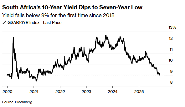 行情数据显示,南非约翰内斯堡证券交易所(JSE)FTSE/JSE所有股票指数在年内迄今的涨幅已达逾30%。南非兰特汇率也逼近一年高点,该国10年期国债收益率近期则首次跌破9%,创七年来新低。该国通胀放缓促使南非央行降息,进一步提振了市场信心。